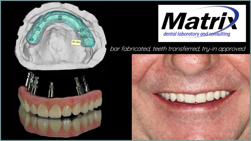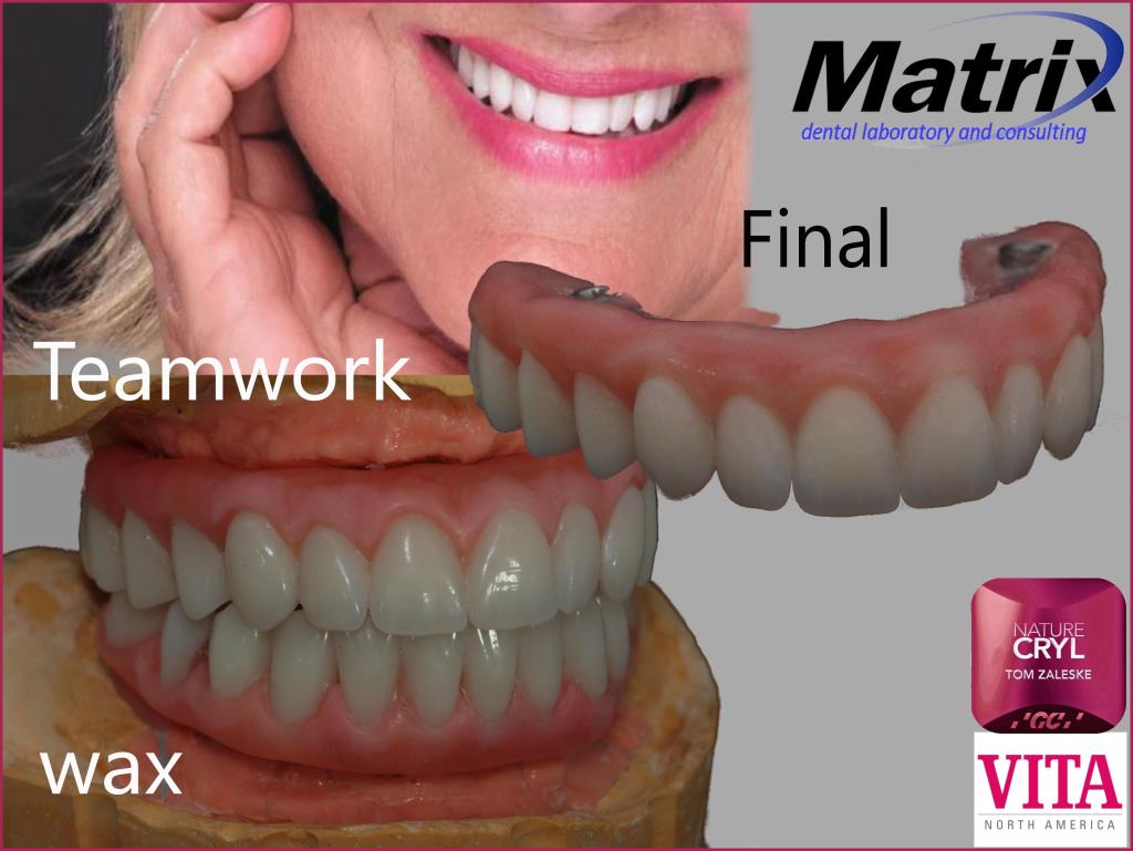 My laboratory has matured to offer prosthetics outside the scope of just conventional dentures. Although I still fabricate the conventional, I now also offer hybrid “All On” implant retained prosthetics. Dentists and their patients find that the fabrication and esthetic skills Matrix Dental Laboratory has become known for are an ideal compliment for implant hybrid bar treatment.