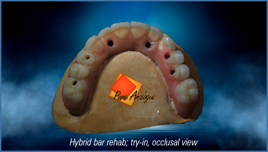 This case is an upper (maxillary) implant supported bar, and a lower (mandibular) conventional overdenture using the remaining canine roots with attachments incorporated to provide a snap fit foundation.