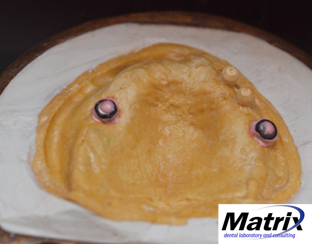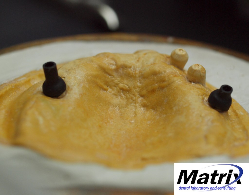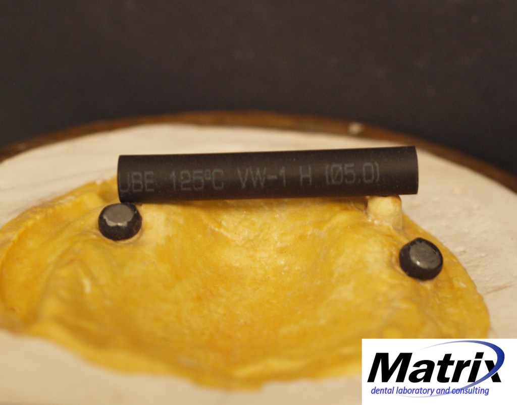To aid in providing ideal space, I use a technique where I use heat shrink tubing to prevent over adjusting the holes and provide only a slight increase in circumferential space. The non stick property of the tubing allows for easy removal after processing.The tubing fits perfectly around the locator attachment and once heated with a heat gun, shrinks tightly around the locator cap.The tubing is cut “flush” with the cap so as to not interfere occlusally.Rubber sep is applied around the circumference of the tubing to prevent the acrylic from creeping underneath. A small amount is also applied to the top to also preventacrylic from finding its way in.Once the rubber sep is dry, its ready to pack or inject.