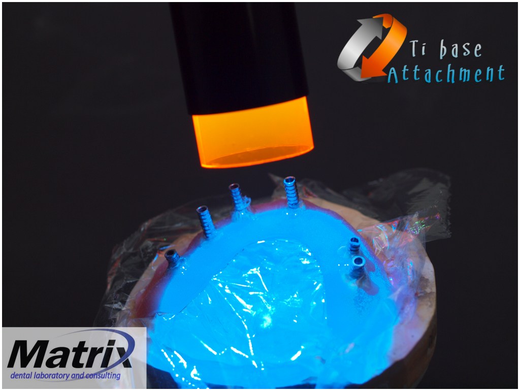 I use light cure fixation of cylinders to the base. It’s clean and exacting. I precure using a Dreve curing wand and then I remove the assembly and cure in a GC Labolight Duo for a 3 min cycle on both sides to assure thorough curing. Cylinders are then cut down to appropriate levels to accommodate tooth placements. By the way, did you notice the clear sheet under the base?