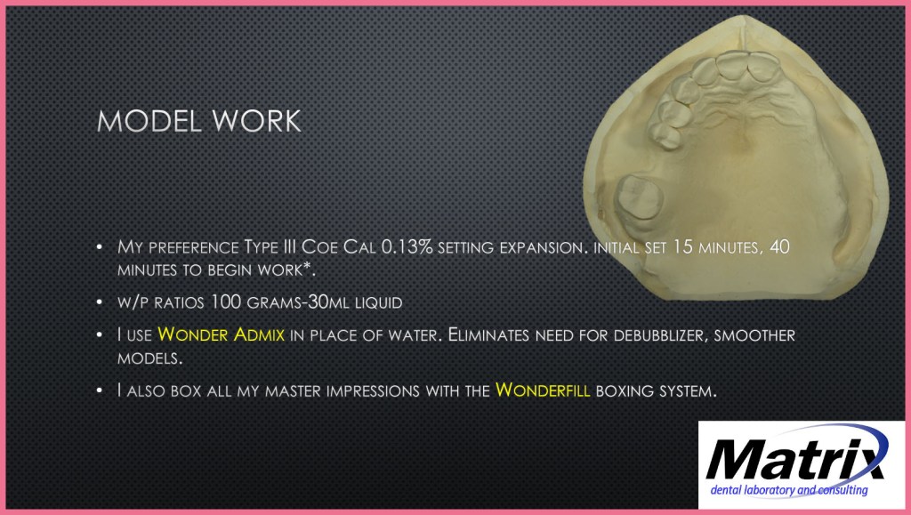 Adhering to water/powder ratios, understanding material science, practicing the highest best way, to record the border extensions of the impression, are things that turn that impression into an accurate master model. This comes from my formal education background and practice of that newly acquired education as an in-house technician the first 8 years of my career.