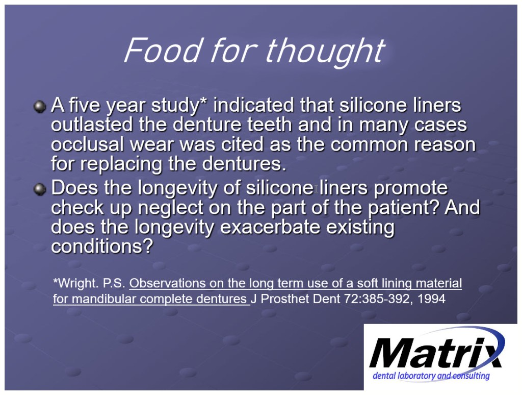 As this study indicates denture teeth wear faster than the silicone liners erode. If the ridge continues to remodel naturally and/or is exacerbated by medications and metabolic conditions and the fit and function evaluations(recalls) are lengthened between visits, it only makes sense that people have a better chance of developing parafunctional conditions which will promote faster tooth wear and further parafunctional compromises.