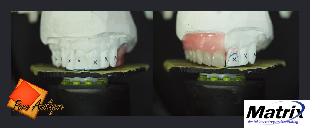 A 2-phase treatment, this will the healing denture which the patient asked for it not to look like chicklets. Photo documentation confirms planes and previous tooth positions. Immediate dentures are difficult especially for patients that roll semi-dentate for years.