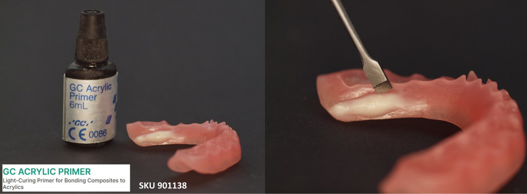The example I show here is a lower arch made of print resin. I treated the surface with air abrasion, cleaned with compressed air, applied a small drop of the primer, and exposed to a 20 second flash under the GC Labolight Duo.